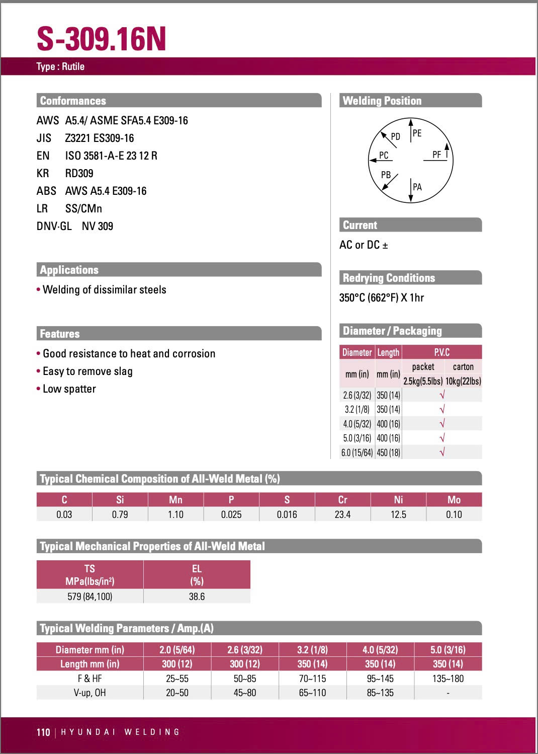 Tiêu chuẩn Mỹ: AWS A5.4/ASME SFA5.4 E309-16 Tiêu chuẩn Nhật Bản: JIS Z3221 ES309-16 Tiêu chuẩn Quốc tế: EEN 1600 - E 23 12 R |